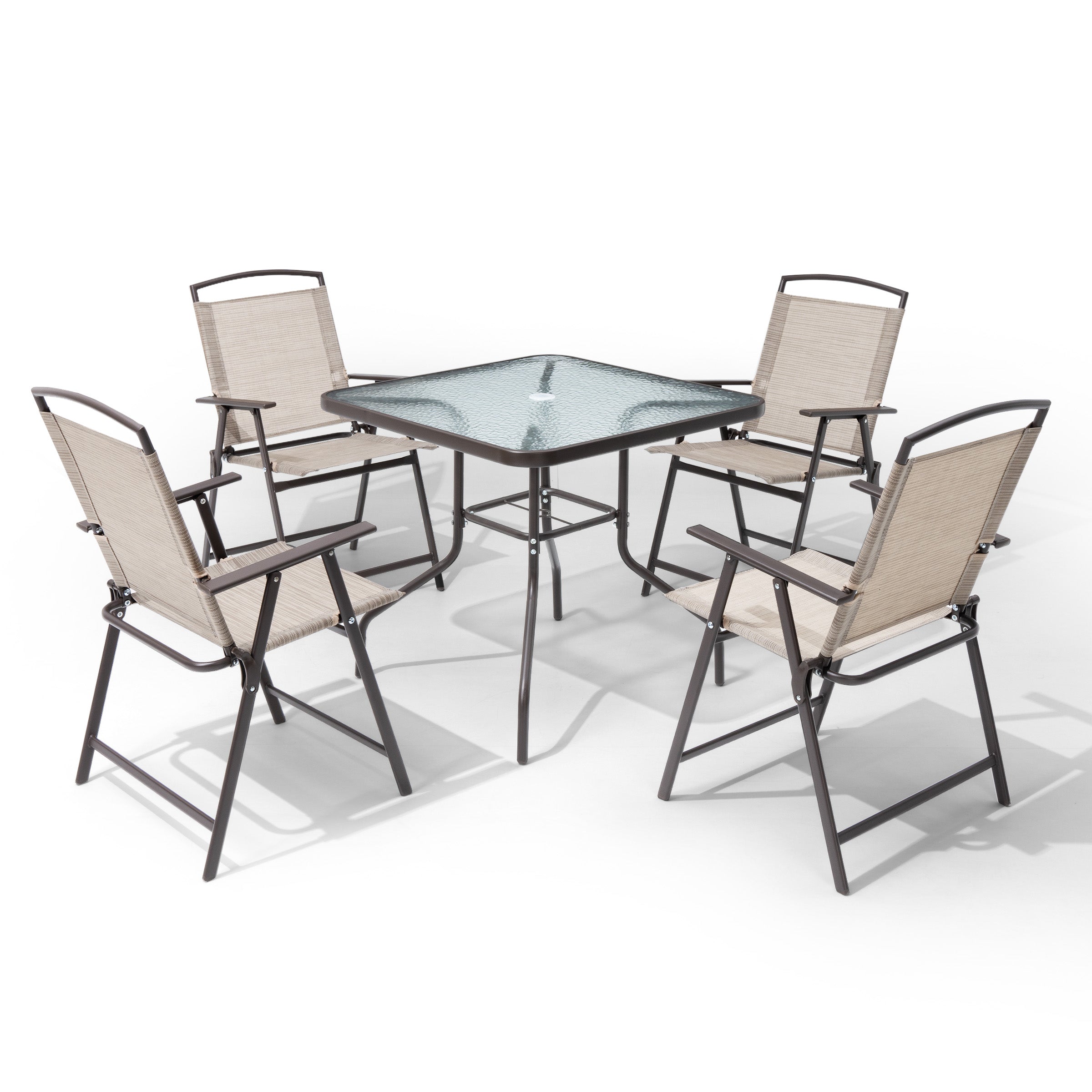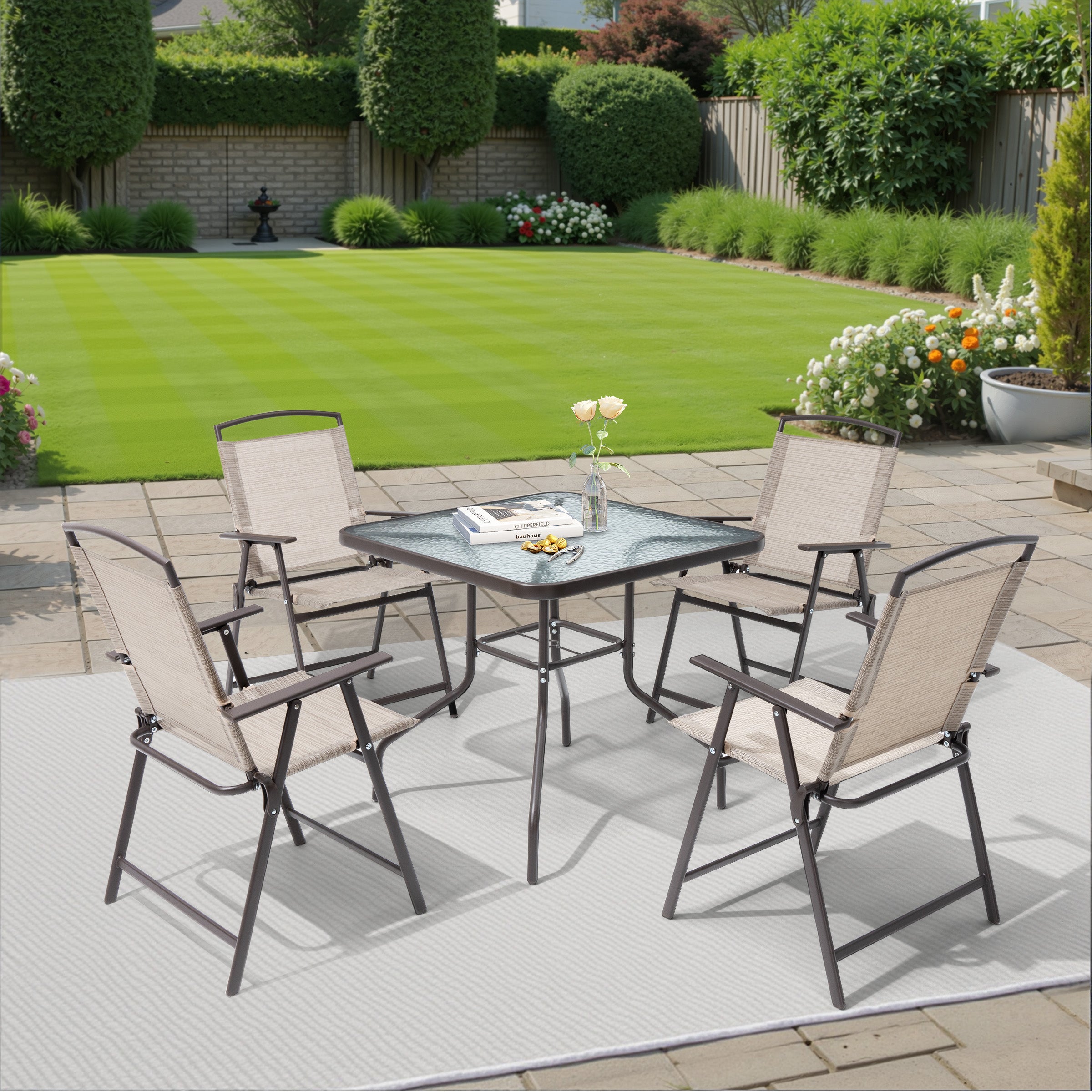 Outdoor Dining Set for 4: This 5-piece patio set includes a square table and four chairs—perfect for family meals, casual chats, or weekend gatherings. Ideal for patios, gardens, decks, or backyards, it creates a cozy and inviting outdoor dining space.