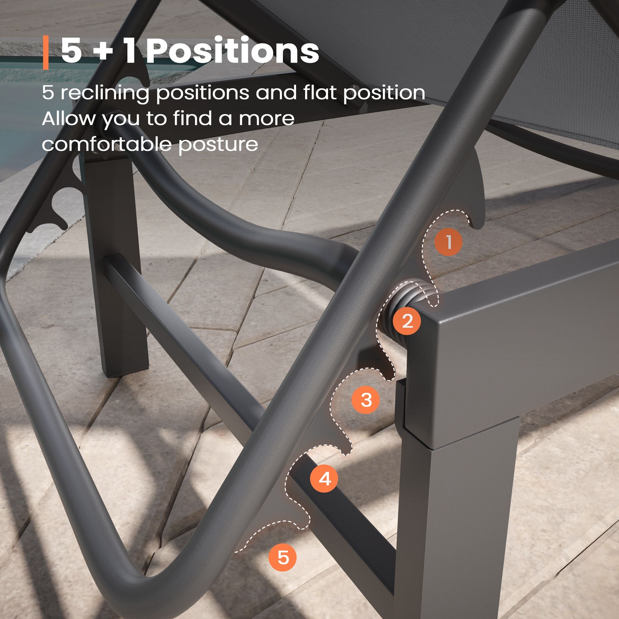 Adjustable Comfort: Designed with an ergonomic sling seat and 5 adjustable reclining positions, this chaise lounge lets you effortlessly find your ideal angle for ultimate relaxation. It helps relieve fatigue and provides excellent waist support for long lounging sessions.