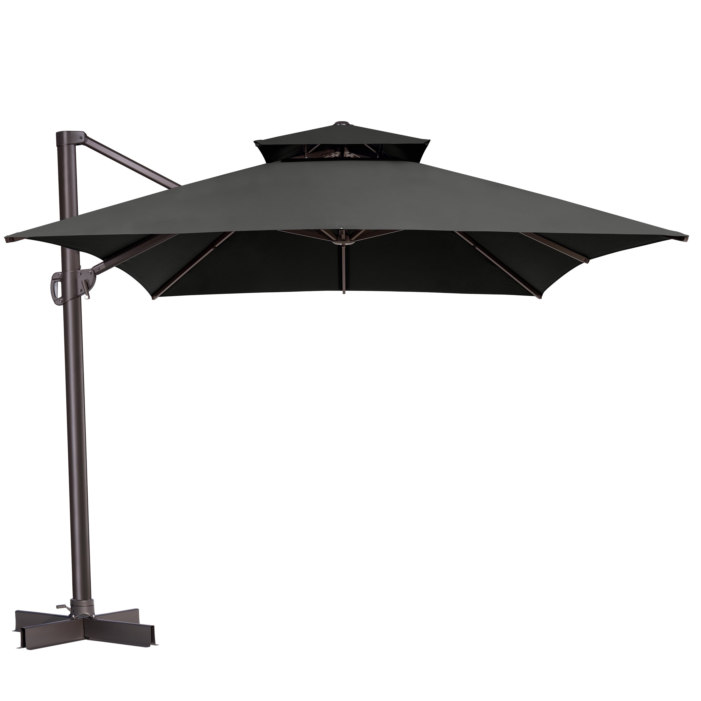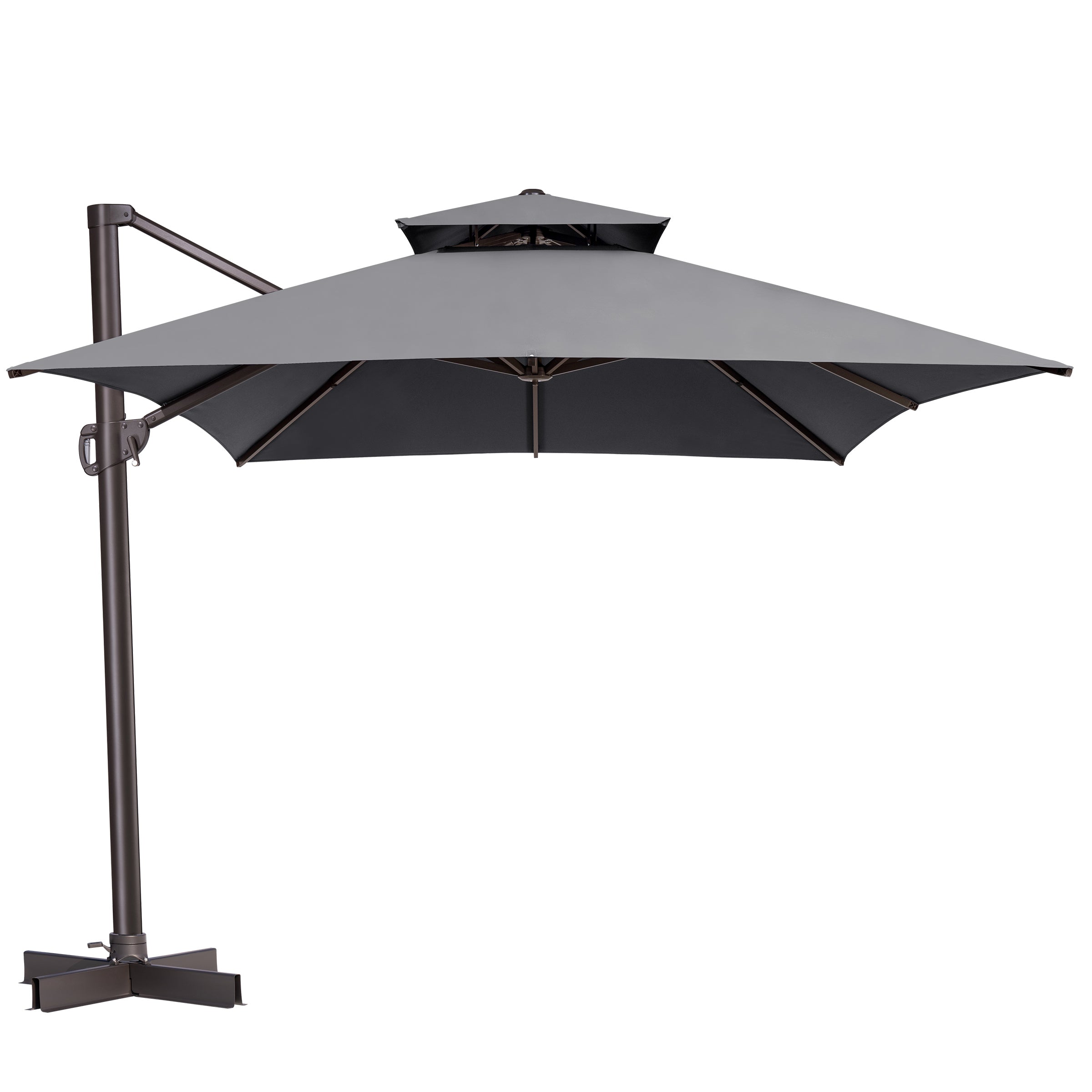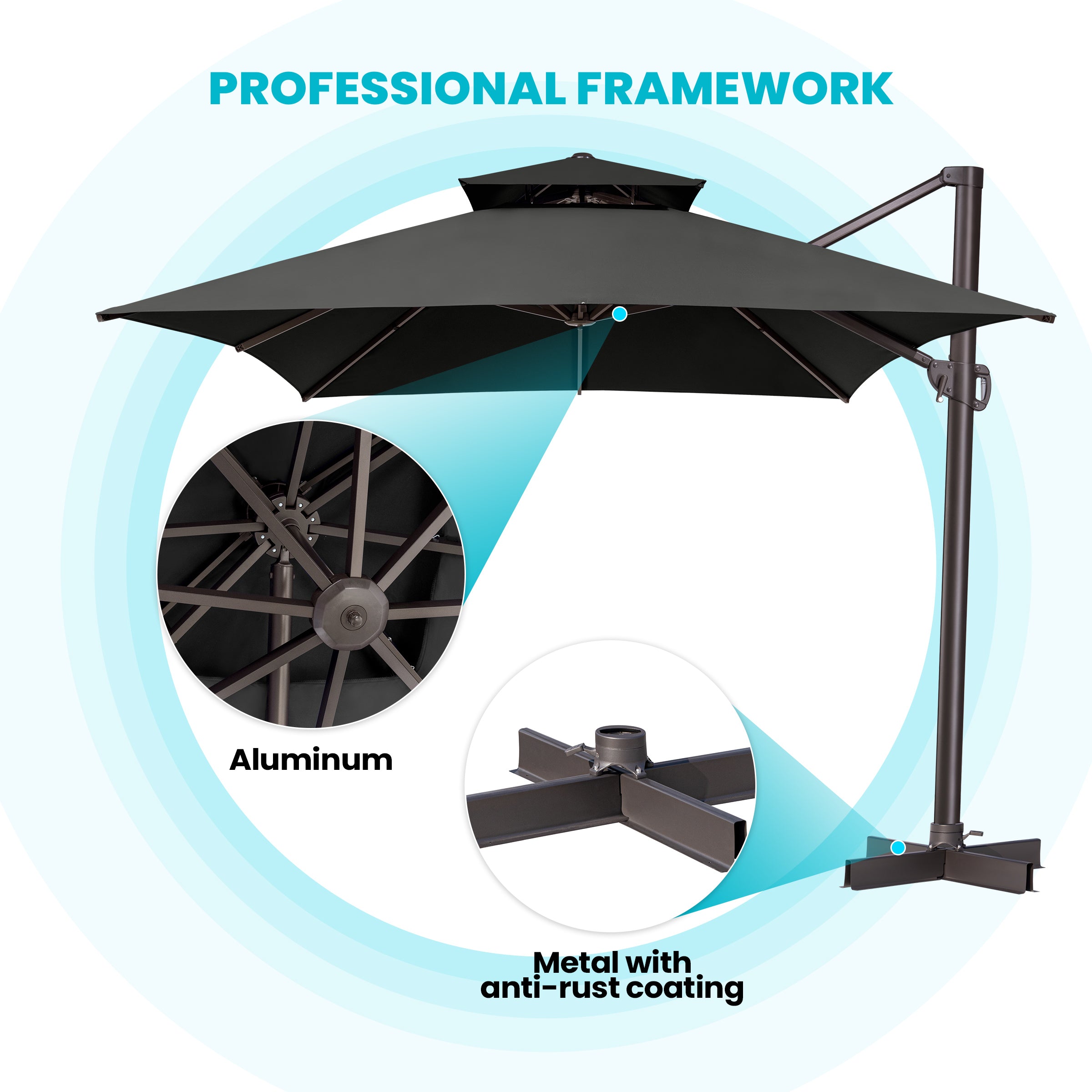 Double-Top Canopy Design: The elegant double-top canopy enhances airflow and stability in light winds, keeping your outdoor space cool and comfortable. Note: The umbrella should be lowered and secured in windy conditions or when not in use.
