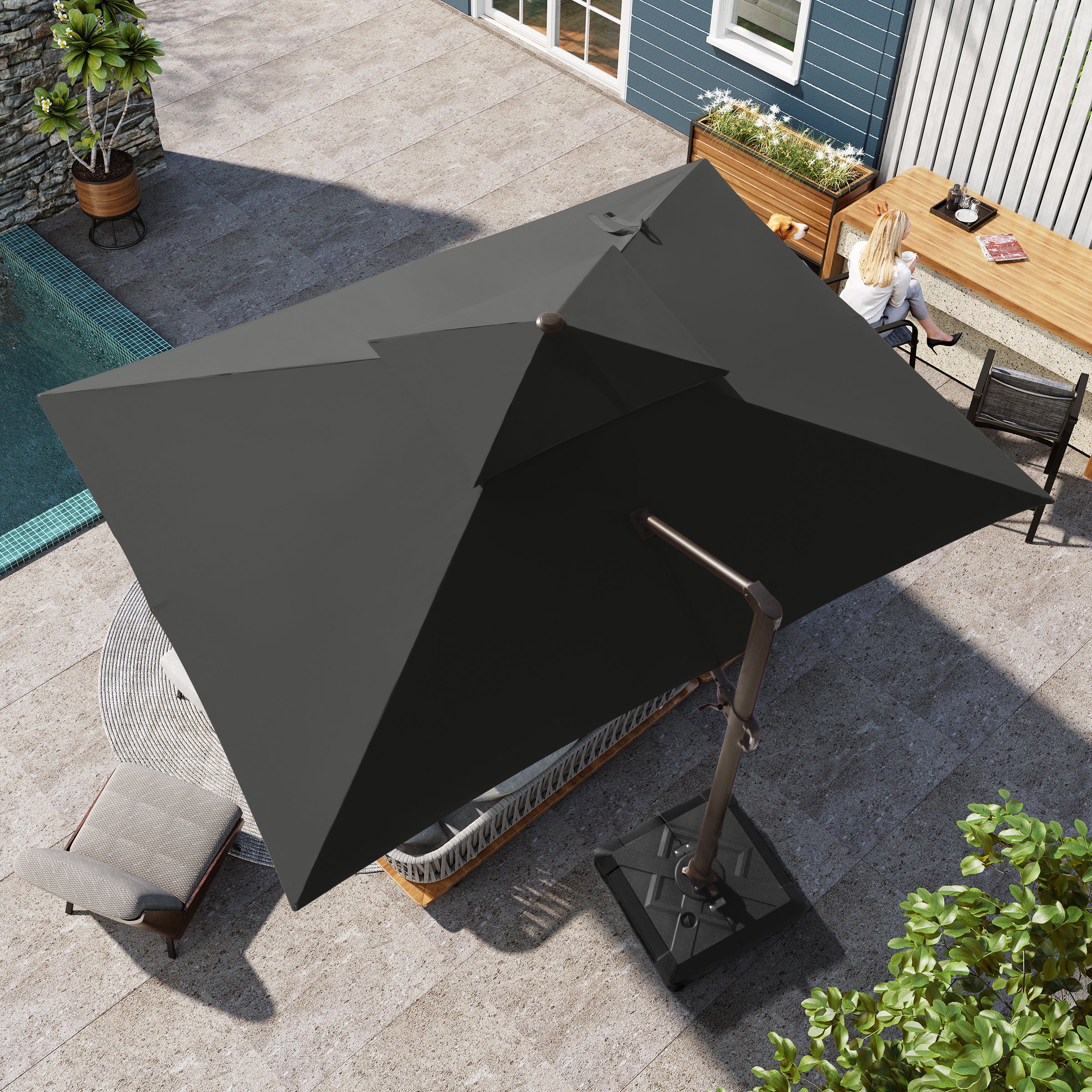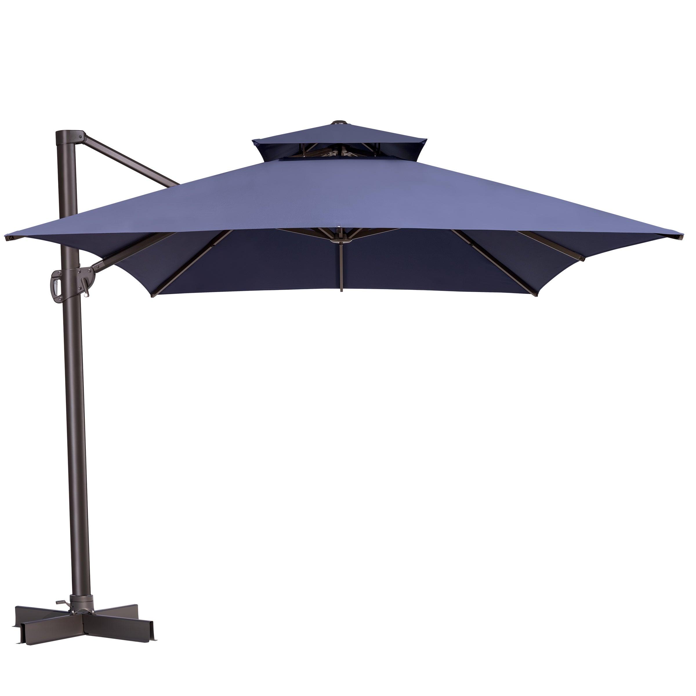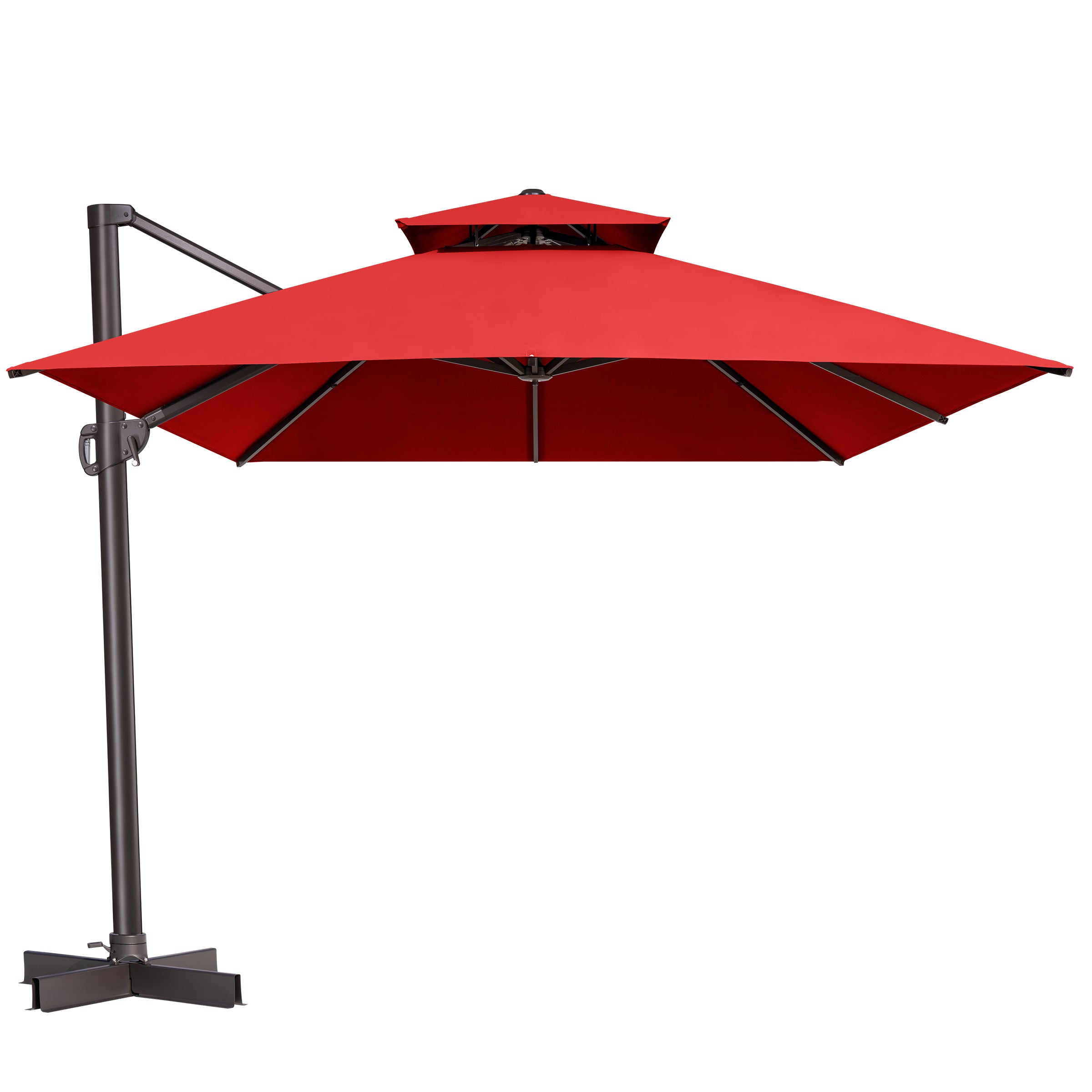 Double-Top Canopy Design: The elegant double-top canopy enhances airflow and stability in light winds, keeping your outdoor space cool and comfortable. Note: The umbrella should be lowered and secured in windy conditions or when not in use.