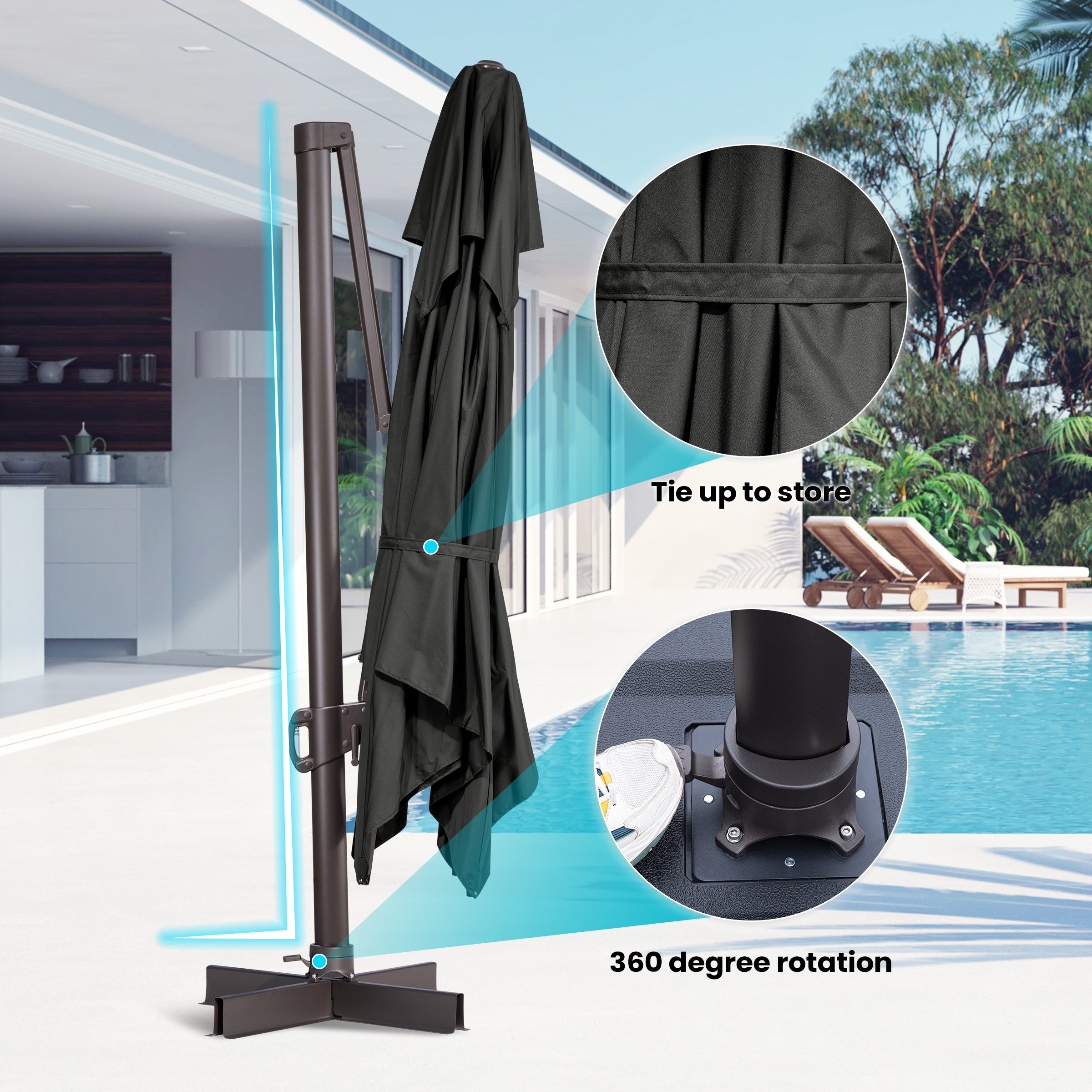 Flexible Tilt & 360° Rotation: Easily adjust your shade with the 5-position tilt handle or rotate the umbrella 360° using the foot pedal—ensuring full coverage and comfort throughout the day.
