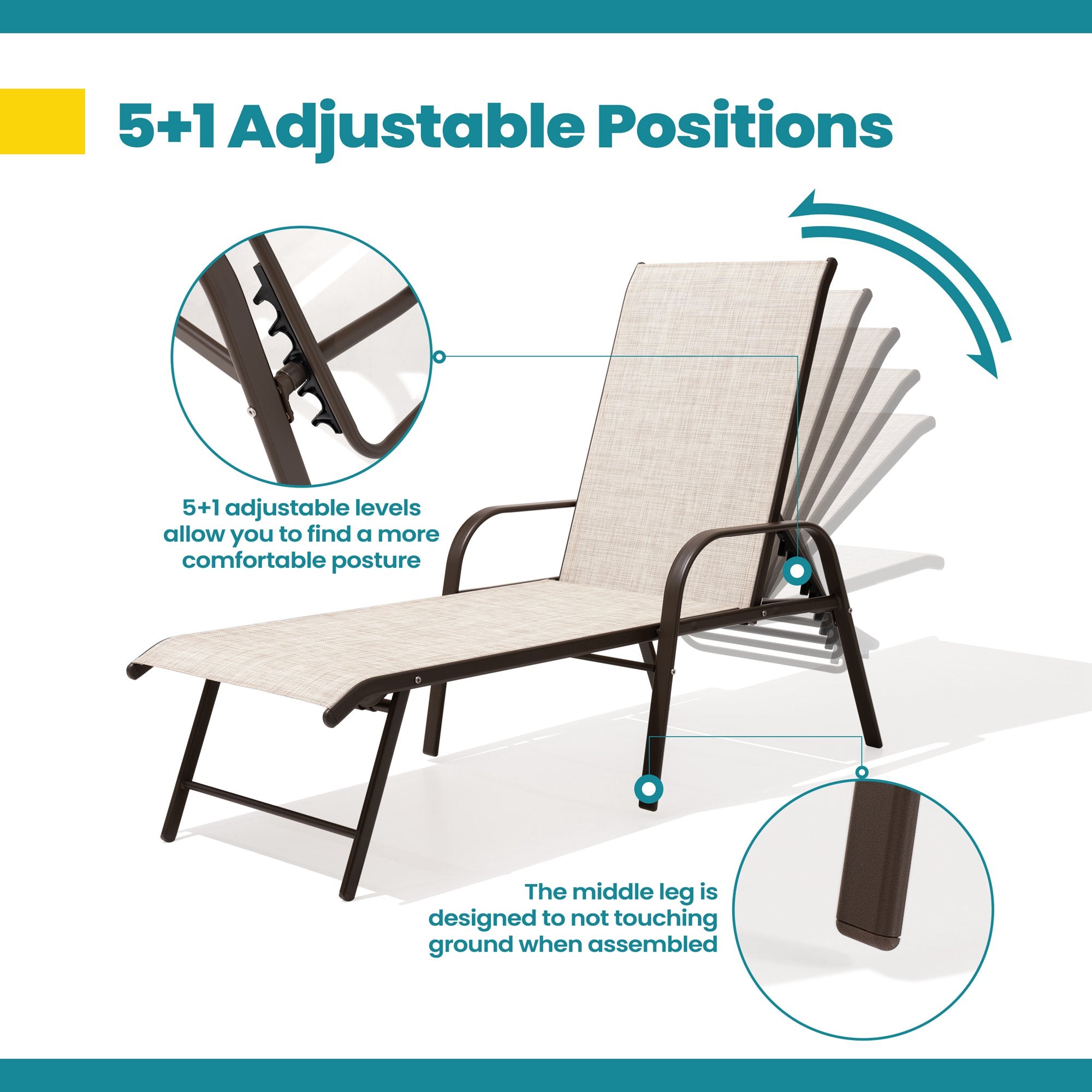 Adjustable Backrest: The 5-position adjustable backrest lets you easily find your ideal angle for reading, lounging, or sunbathing. Recline it fully flat for a peaceful nap or keep it upright to enjoy a relaxing time outdoors—comfort at every position.