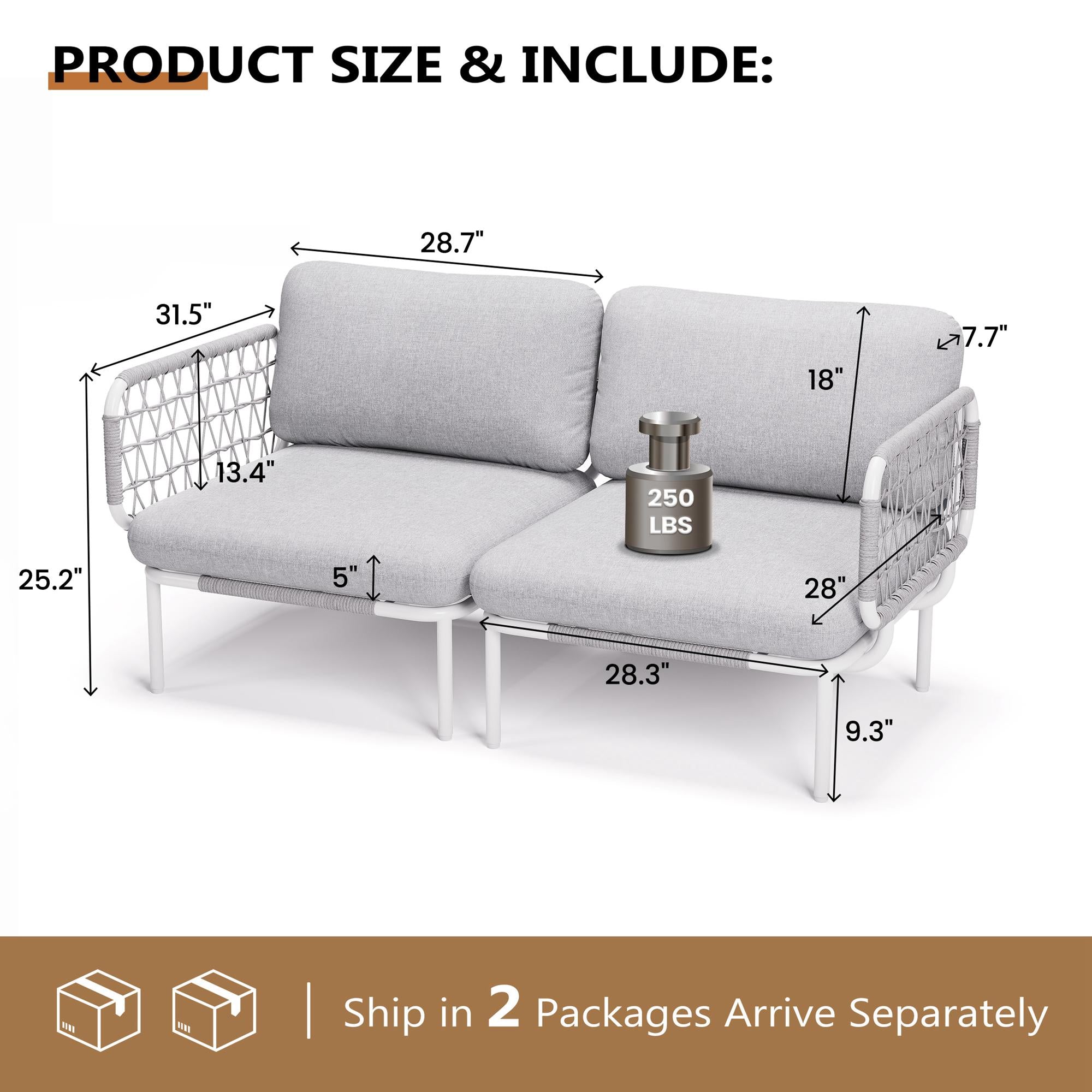 Dimensions: Single sofa: 28.3" W x 28.3" D x 9.3" H; Seat cushion: 28.7" L x 28.7" W x 4.5" T; Armrest: 13.4" W x 31.5" L; Back cushion: 28.7" L x 18.1" W. Note: Keep covered with tarp during inclement weather.