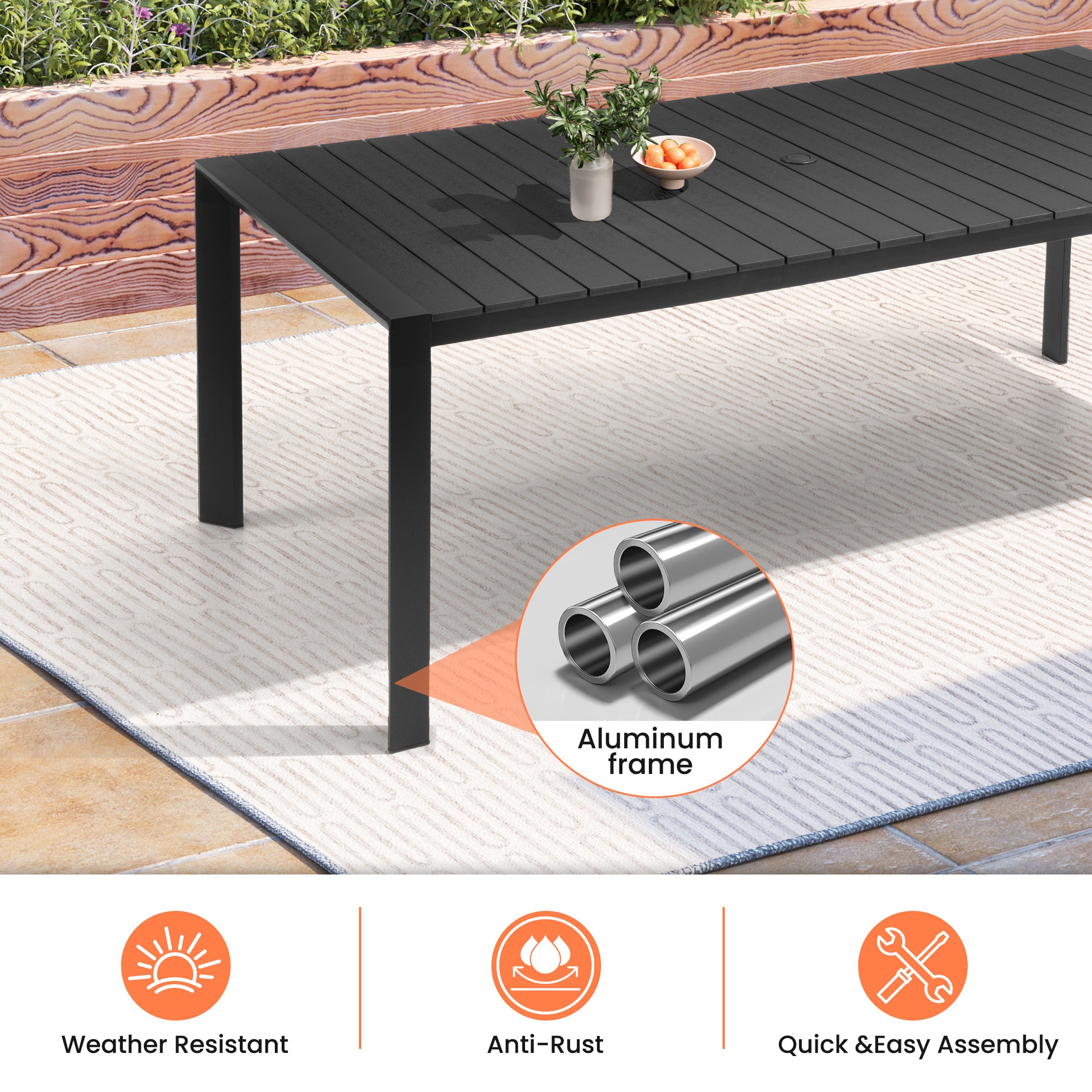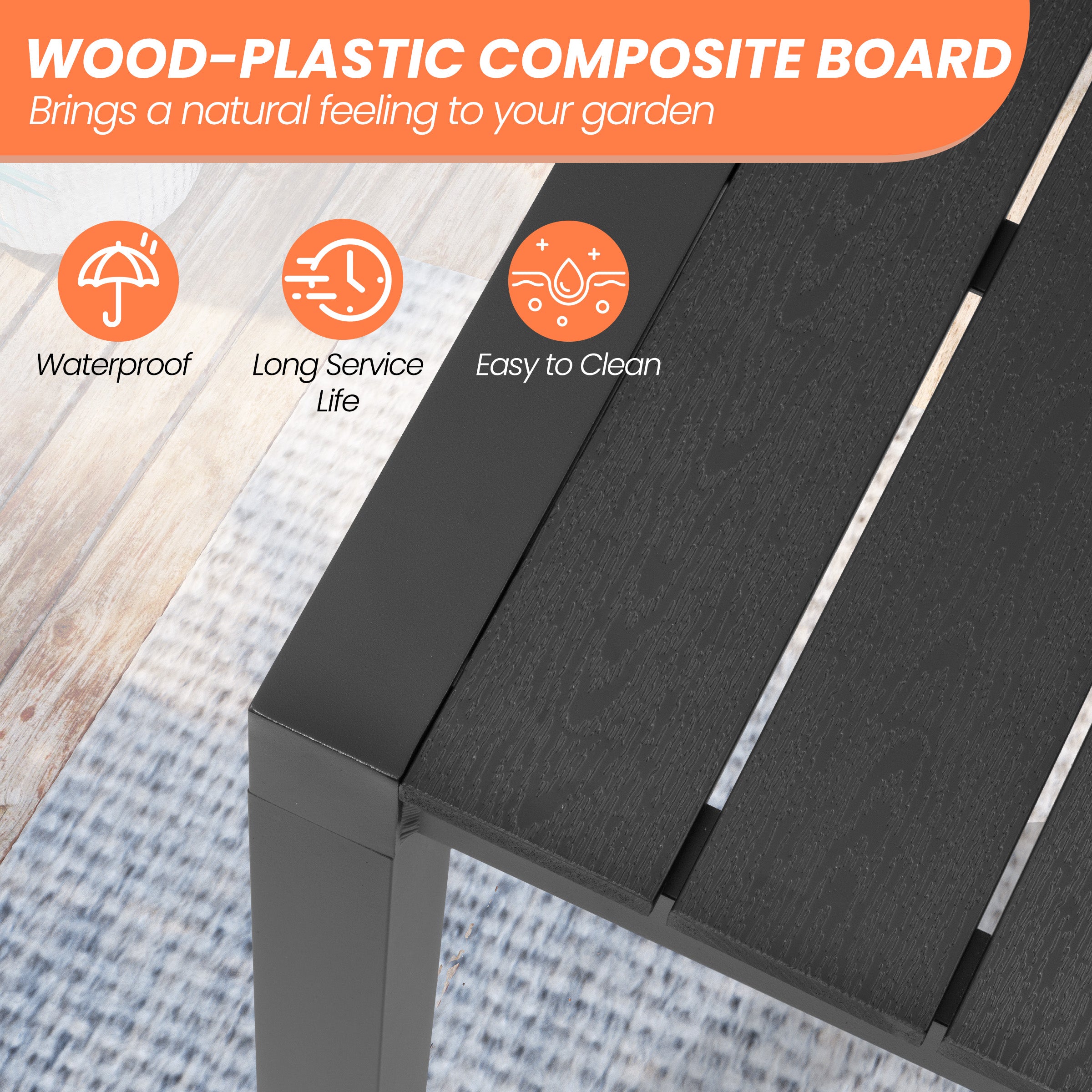 Eco-Friendly Plastic Wood Top: Blending the natural beauty of wood with the resilience of plastic, this tabletop is waterproof, moisture- and insect-resistant, and won't warp or crack—making it ideal for year-round outdoor use.