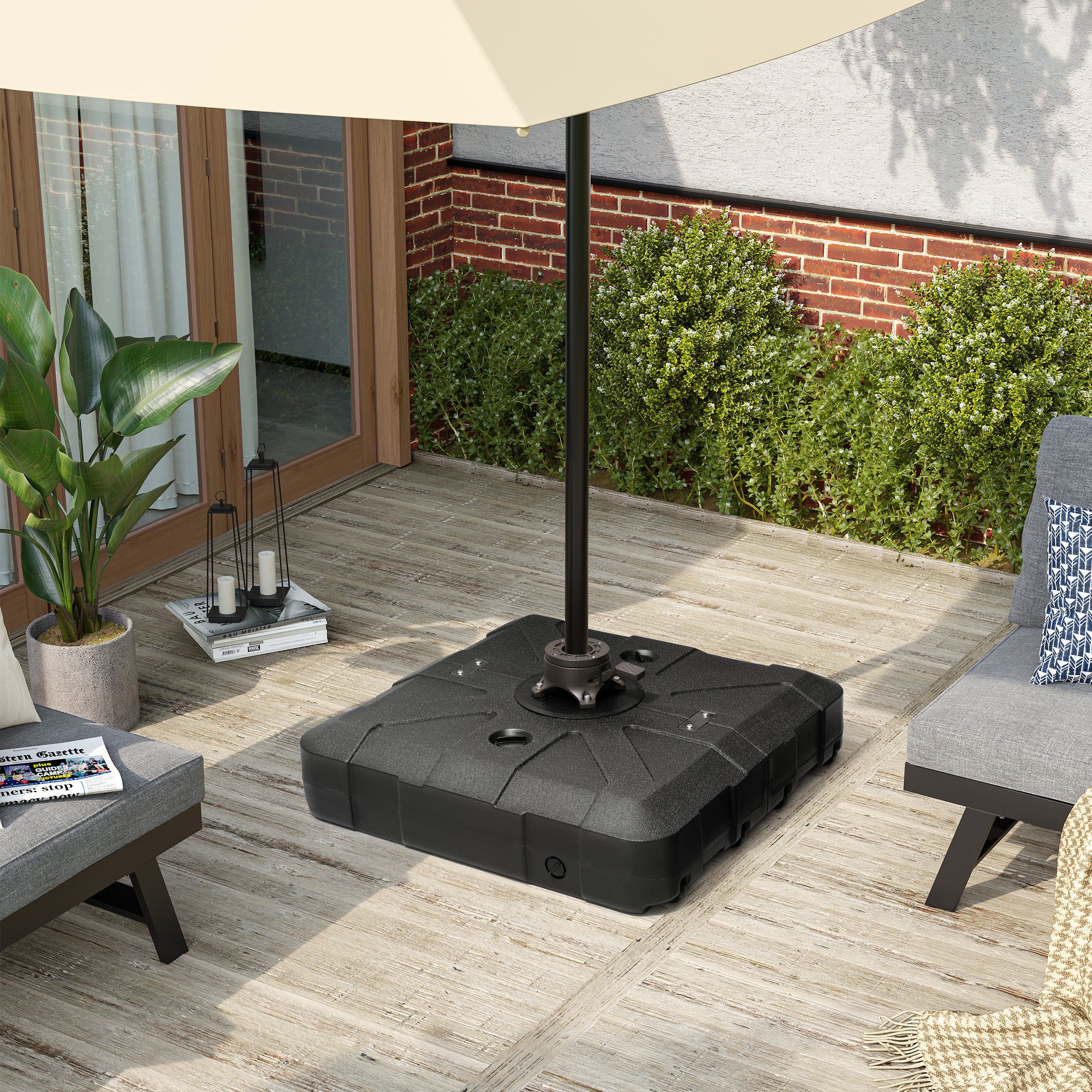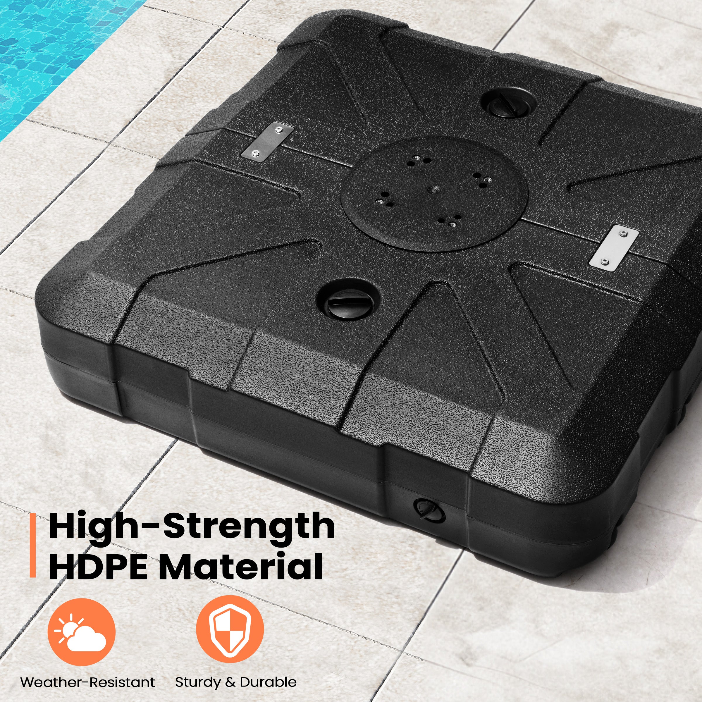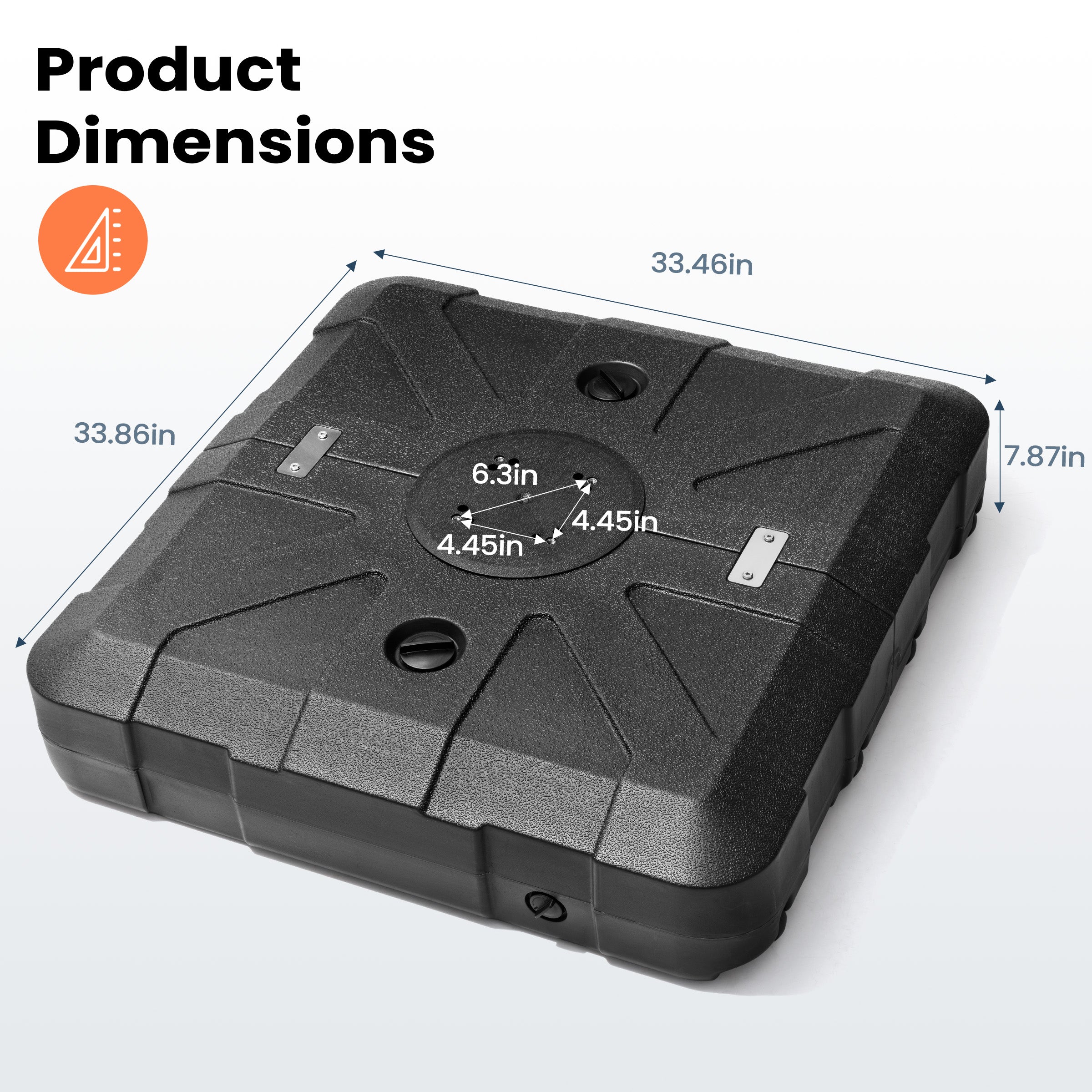 Fit Most Cantilever Umbrellas: No cross base required. Overall size: 33.86" L x 33.46" W x 7.87" H; screw-hole diagonal: 6.3". For optimal stability, fill with at least 50% sand—up to 265 lbs when filled with wet sand. Please measure your umbrella's rotation part before purchase.
