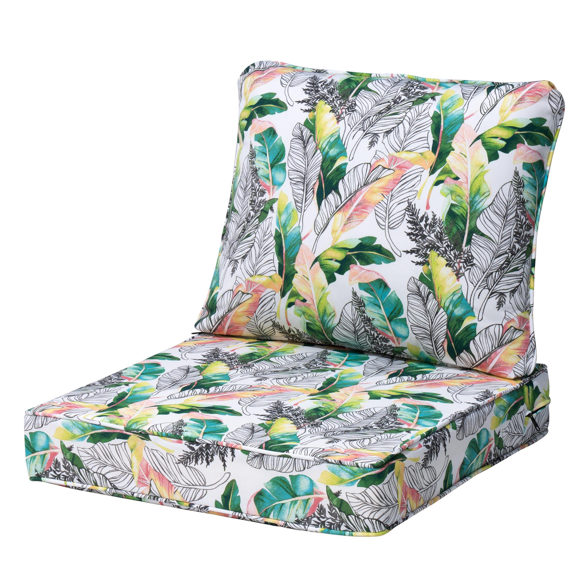 Dimension: Includes 1 seat cushion (25" W x 24" D x 4.7" T) and 1 back cushion (19.3" W x 24.4" D). Designed to fit most deep-seating outdoor chairs, this set keeps your patio space stylish, fresh, and cozy—perfect for the porch, lawn, or poolside. Note: Please check the size before purchase to ensure a proper fit!