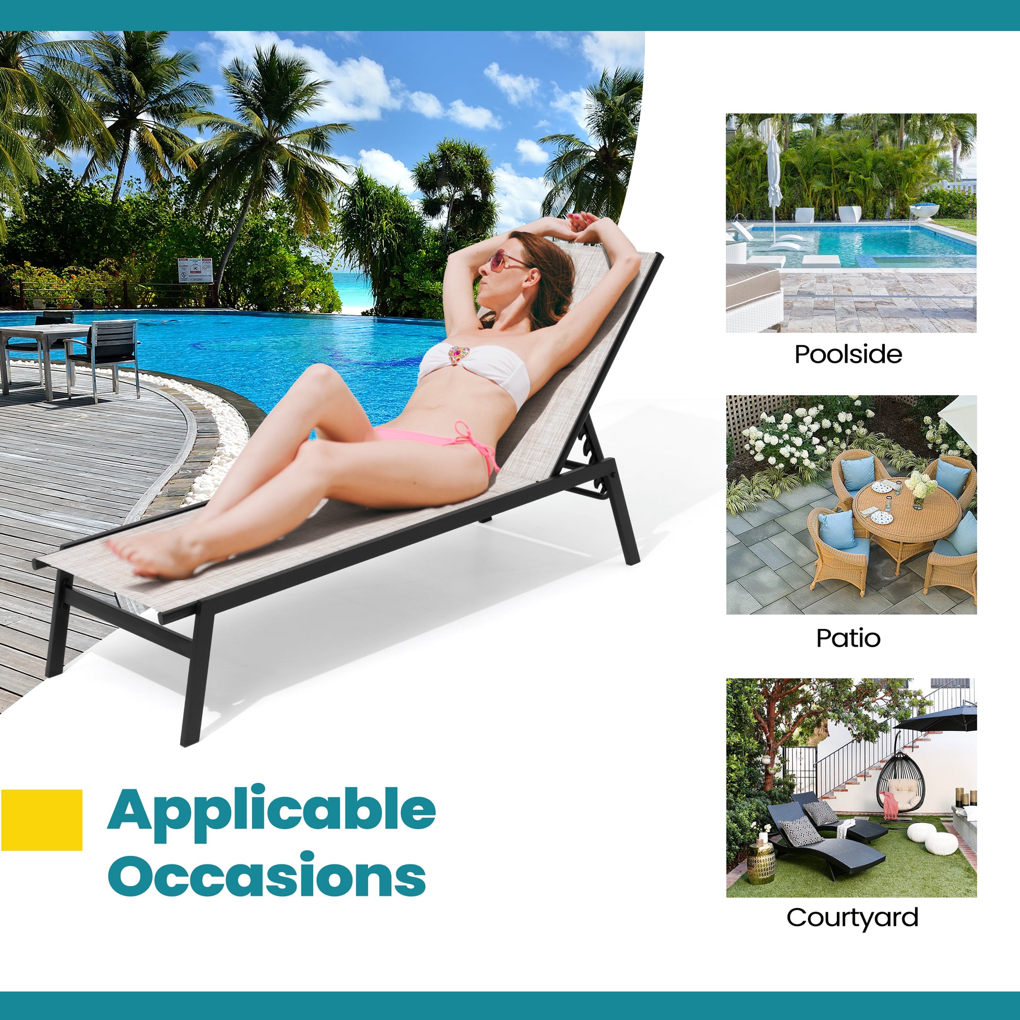 Adjustable Backrest: Features 4 reclining positions including a fully flat option, allowing you to easily find your perfect angle for reading, lounging, or sunbathing. Sit upright to enjoy a drink or lay it flat for a peaceful outdoor nap.