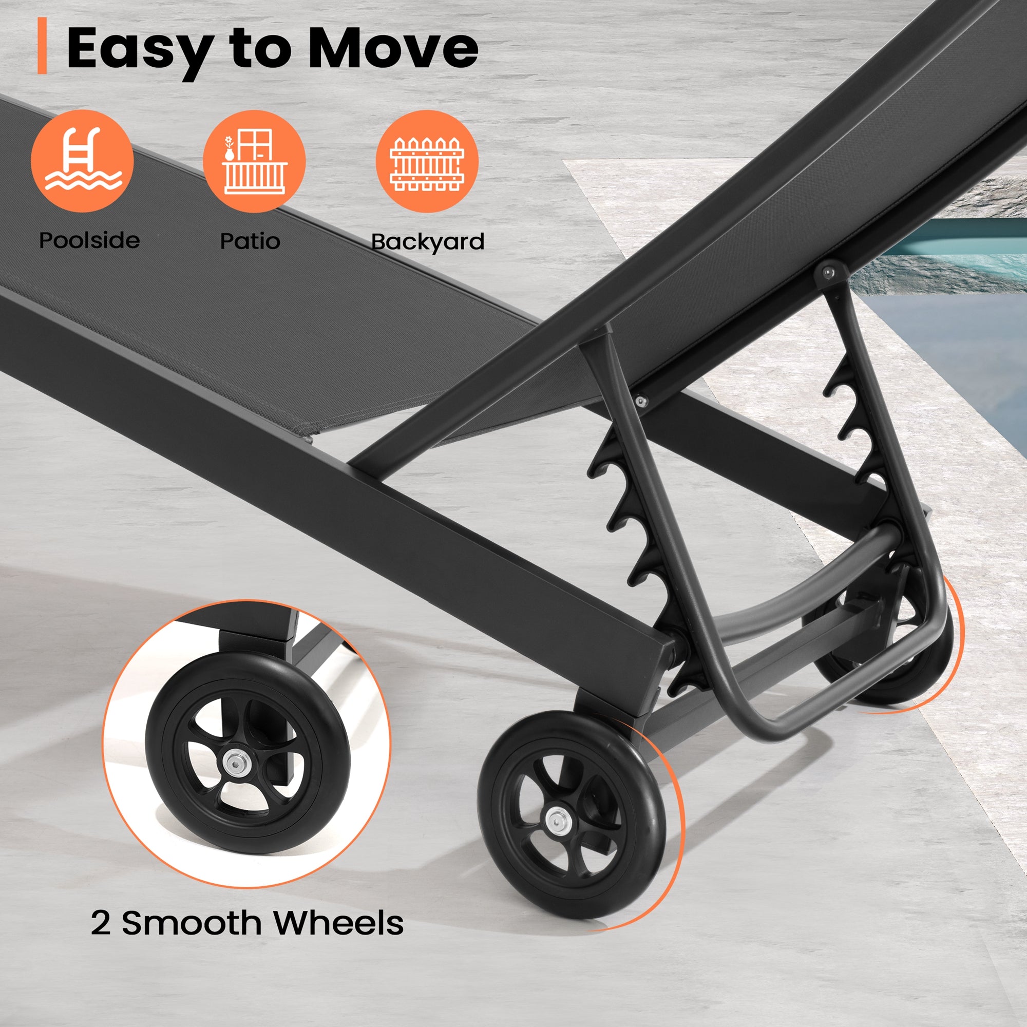 Lounge on Wheels: Effortlessly follow the sun or find the perfect shade. The built-in rear wheels let you roll the chaise smoothly across your patio, poolside, or garden with minimal effort.