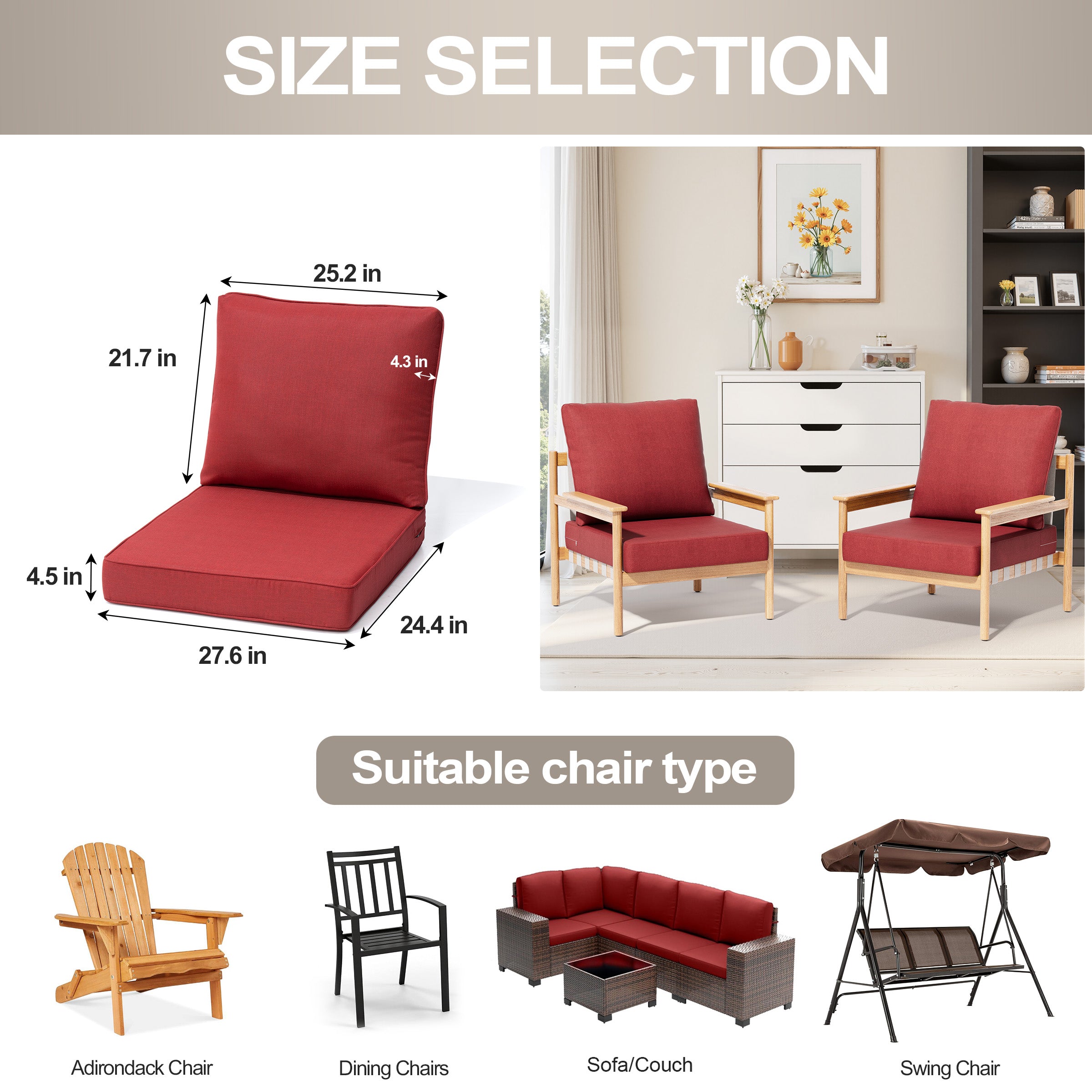 Perfect Fit: Includes one seat cushion (27.6" W x 24.4" D x 4.5" T) and one back cushion (21.7" W x 25.2" D), fitting most deep outdoor seating. Ideal for the porch, patio, or poolside, they keep your space stylish, fresh, and inviting. Note: Please check the size before purchase to ensure a proper fit!